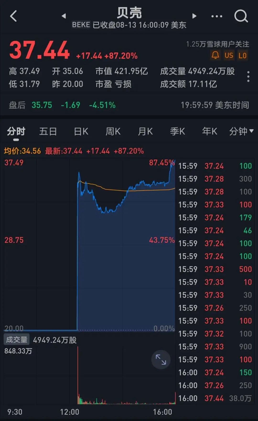 上市首日,貝殼開盤價報35.06美元,開盤即大漲75%,最終收報37.44美元,收漲87.20%,市值突破420億美元。